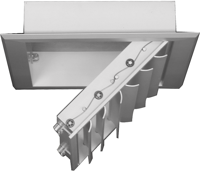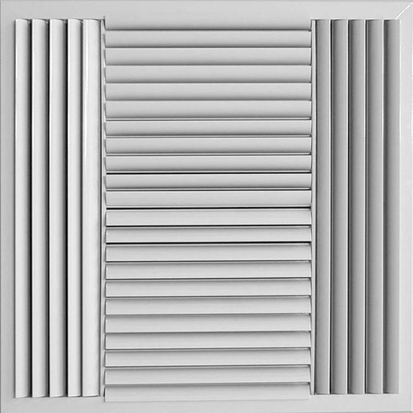Supply air ceiling diffuser, square or rectangular, with curved adjustable blades for alteration of the air jet. With one (OK1), two (OK2), three (OK3) or four (OK4) way throw pattern. Made by anodized aluminium. Electrostatic paint in RAL color is possible. Also is possible the bridging of the blades for simultaneously rotation. For use in heating and cooling cases in low and medium installation height.