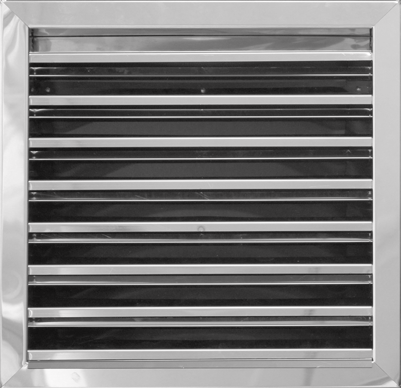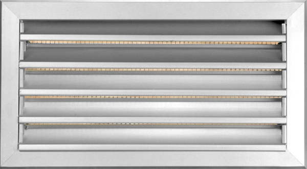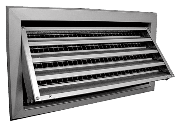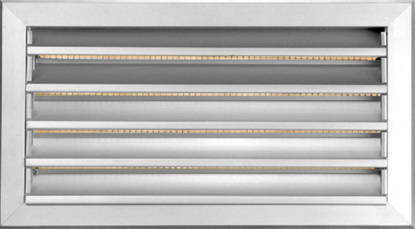 Weather grille for external wall installation made by anodized aluminium. With fixed blades in angle 45o and galvanized wire mesh (6X6 mm) for protection of the air conditioning system from the rain and foreign objects. Suitable for air intake or exhaust. The blades are parallel to the first mentioned dimension. Electrostatic paint in RAL color is possible.