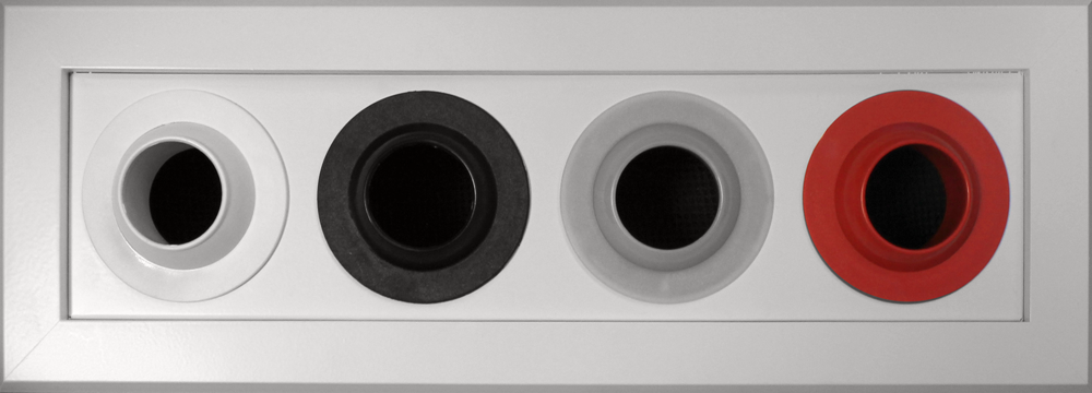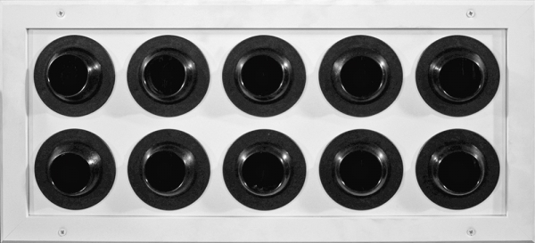 - AMB-AP-Φ42: Set of many jet nozzles in rectangular frame made by aluminium, anodized or painted electrostatically in RAL color. Only the adjustable heads of the plastic jet nozzles (they are produced in certain colors) are visible.