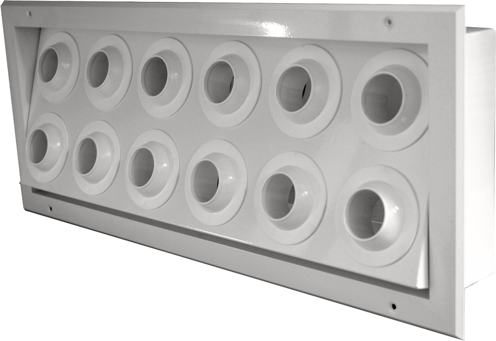 - AMB-AP-Φ42-D/DK: Set of many jet nozzles in rectangular frame made by aluminium, anodized or painted electrostatically in RAL color. Only the adjustable heads of the plastic jet nozzles (they are produced in certain colors) are visible. With air volume control damper with simultaneously opposite rotated blades (-D) or flap type (-DK).
