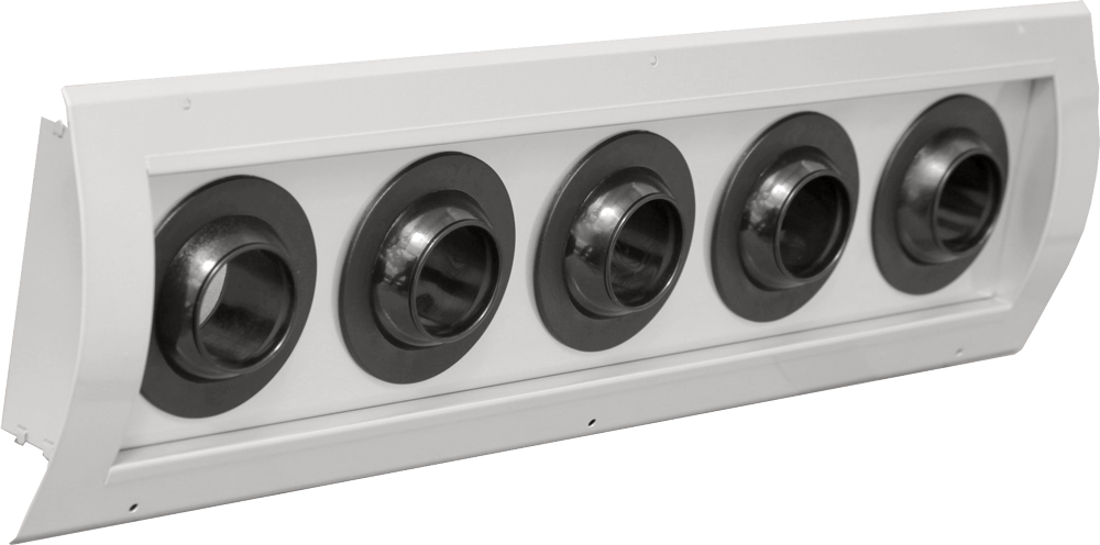 - AMB-AP-SR-Φ42: Set of many jet nozzles, in rectangular frame, curved for direct installation in the side of round air duct. The frame is manufactured by sheet steel galvanized or painted electrostatically in RAL color. Only the adjustable heads of the plastic jet nozzles (they are produced in certain colors) are visible.